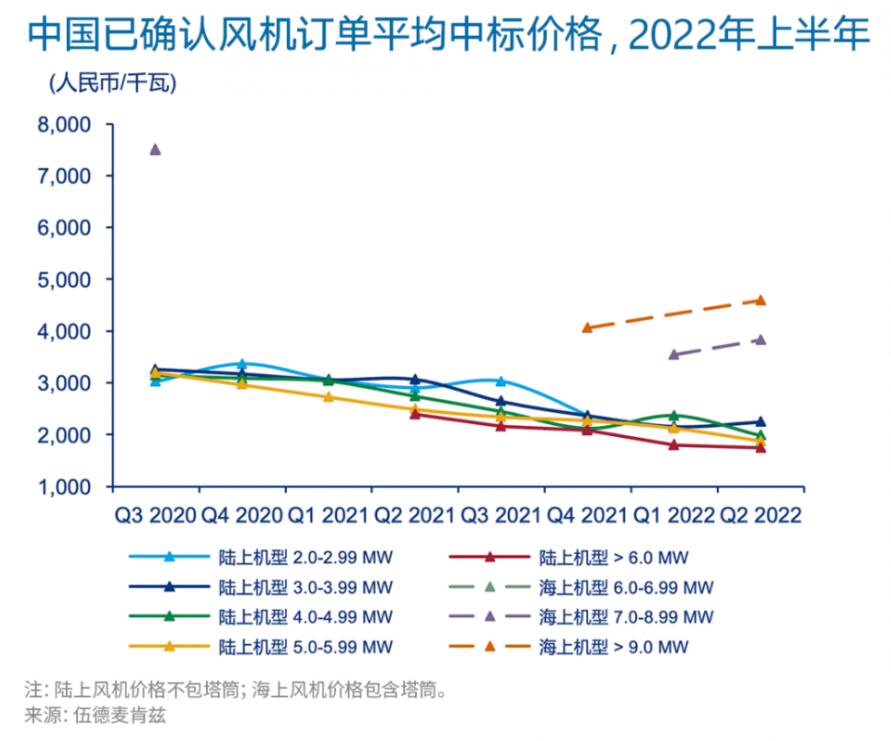 陸上風(fēng)機(jī)平均中標(biāo)價格在2022年第一季度再創(chuàng)新低。在首個7MW+陸上風(fēng)電機(jī)組的批量訂單中,出現(xiàn)了歷史最低中標(biāo)價格1408元/千瓦(不含塔筒)。雖然第二季度價格略有回升,但較2021年底水平仍下降了15%。新簽無補(bǔ)貼的海上項(xiàng)目與時間上最鄰近的有補(bǔ)貼的海上項(xiàng)目(2020年)相比,風(fēng)機(jī)平均中標(biāo)價格(含塔筒)下降了超過40%。大兆瓦機(jī)組的廣泛應(yīng)用,使中國風(fēng)電整機(jī)商能夠以較低的單位千瓦價格進(jìn)行投標(biāo)。例如,6MW陸上風(fēng)機(jī)的平均價格比3MW陸上風(fēng)機(jī)平均價格低22%。