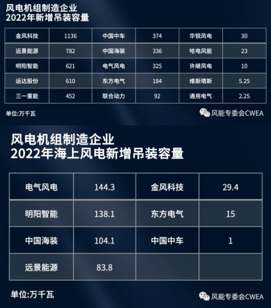 2022年,中國新增吊裝容量前五的風(fēng)電機(jī)組制造企業(yè)是金風(fēng)科技、遠(yuǎn)景能源、明陽智能、運(yùn)達(dá)股份、三一重能,其新增裝機(jī)容量分別為1136萬千瓦、782萬千瓦、621萬千瓦、610萬千瓦、452萬千瓦。
