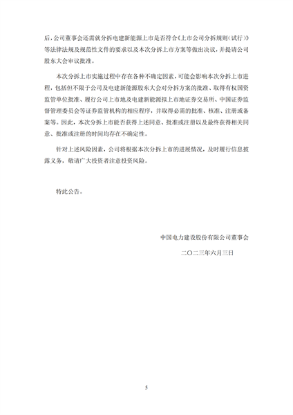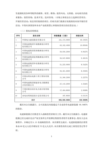 根據(jù)公告,擬拆分的中電建新能源集團(tuán)股份有限公司注冊(cè)資本為60億元,經(jīng)營(yíng)范圍包括水電發(fā)電、風(fēng)力發(fā)電、太陽(yáng)能發(fā)電、生物發(fā)電再生能源開發(fā)等。目前,電建新能源正在推進(jìn)引入戰(zhàn)略投資者相關(guān)工作。