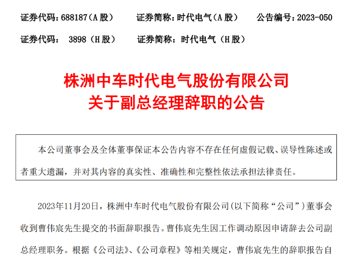 公告披露,2023年11月20日,時(shí)代電氣董事會(huì)收到曹偉宸先生提交的書面辭職報(bào)告。曹偉宸先生因工作調(diào)動(dòng)原因申請(qǐng)辭去公司副總經(jīng)理職務(wù)。根據(jù)《公司法》、《公司章程》等相關(guān)規(guī)定,曹偉宸先生的辭職報(bào)告自送達(dá)董事會(huì)之日起生效。截至本公告披露日,曹偉宸先生未持有公司股份。