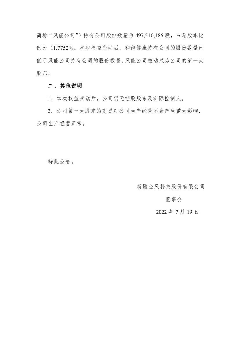 金風(fēng)科技日前發(fā)布《關(guān)于第一大股東變更的提示性公告》。截至2022年7月19日,公司原第一大股東和諧健康保險(xiǎn)股份有限公司-萬能產(chǎn)品(簡(jiǎn)稱“和諧健康”)所持公司的股份數(shù)量占總股本比例減少至11.7356%,原第二大股東新疆風(fēng)能有限責(zé)任公司(簡(jiǎn)稱“風(fēng)能公司”)被動(dòng)成為公司的第一大股東。