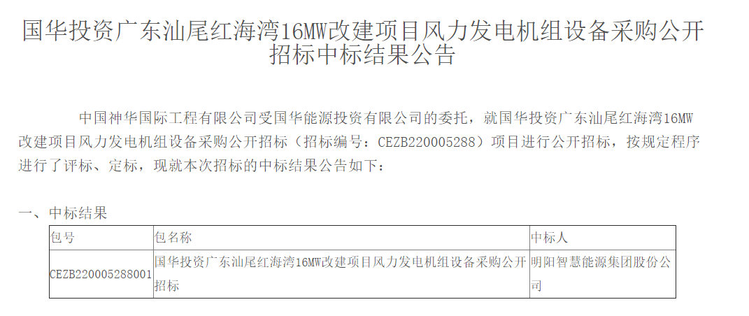 日前,國華投資廣東汕尾紅海灣16MW改建項目風力發(fā)電機組設備采購公開招標結果,明陽智能成功中標;國華投資國華(汕尾)風電有限公司紅海灣風電場項目EPC總承包工程公開招標結果,明陽智能旗下潤陽能源技術有限公司(簡稱:潤陽能源)全資子公司天津明智潤陽技術有限公司成功中標。