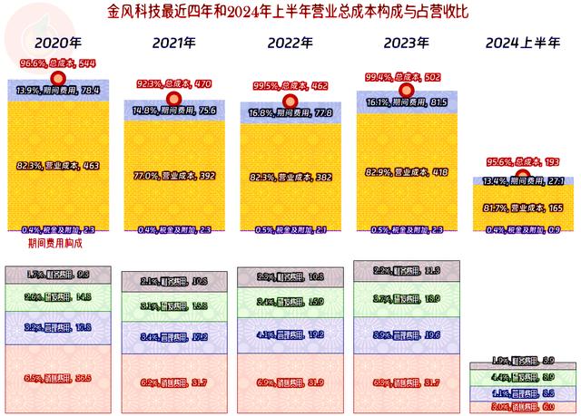 產(chǎn)生這些差異的主要原因是主營業(yè)務(wù)盈利空間變化了,2020年是3.4個(gè)百分點(diǎn),2021年接近8個(gè)百分點(diǎn),遙遙領(lǐng)先。2022年和2023年就只有可憐的不到一個(gè)百分點(diǎn),與2020年毛利率差不多,主要差在期間費(fèi)用占營收比上了,準(zhǔn)確說是差在營收規(guī)模比2020年低了。2024年上半年的期間費(fèi)用控制下來了,再加上營收反彈,主營業(yè)務(wù)盈利空間擴(kuò)大至了4.4個(gè)百分點(diǎn),比2020年高,但營收規(guī)模上還有差距,就導(dǎo)致盈利能力還是要差一些。