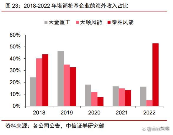 國(guó)內(nèi)企業(yè)塔筒出海勢(shì)頭加速,單樁出口實(shí)現(xiàn)突破。大金重工、天順風(fēng)能、泰勝風(fēng)能的 出口比例接近,國(guó)內(nèi)企業(yè)以出口塔筒產(chǎn)品為主,海外客戶(hù)的供應(yīng)商體制使有出口業(yè)績(jī)的公 司具備更好的客戶(hù)端優(yōu)勢(shì);樁基因運(yùn)輸效率低和方案不成熟的問(wèn)題,需求仍主要由海外本 地產(chǎn)能滿(mǎn)足。根據(jù)大金重工公告,公司憑其基礎(chǔ)設(shè)施、港口條件和工藝裝備和對(duì)海外業(yè)務(wù) 的加大投入,于 2022 年攬入 6 項(xiàng)海風(fēng)海外項(xiàng)目,包括 5 項(xiàng)歐洲項(xiàng)目,成為國(guó)內(nèi)首家管樁 產(chǎn)品出口歐洲的企業(yè),打開(kāi)國(guó)產(chǎn)樁基的歐洲市場(chǎng)。