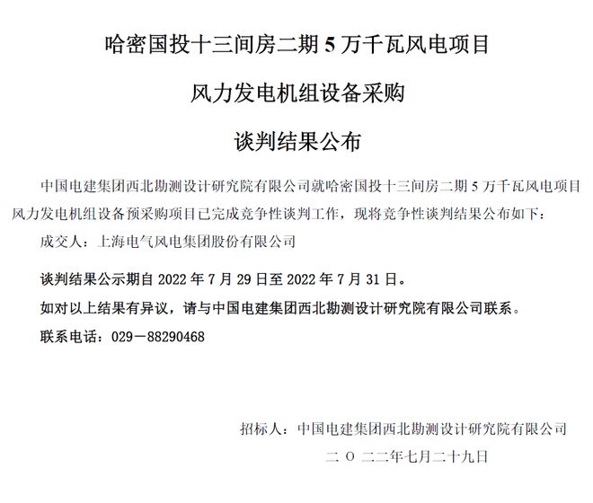 10月20日,中國電建西北院哈密國投十三間房二期5萬千瓦風電項目風力發(fā)電機組設備采購項目入圍公示,電氣風電中標。
