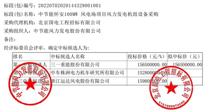 1月28日,中節(jié)能平臺發(fā)布《中節(jié)能懷安100MW風(fēng)電場項(xiàng)目風(fēng)力發(fā)電機(jī)組設(shè)備采購》中標(biāo)候選人公示,三一重能預(yù)中標(biāo),投標(biāo)報(bào)價15650萬元。