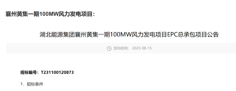 公告顯示,襄州黃集一期100MW風(fēng)力發(fā)電項(xiàng)目位于湖北省襄陽市襄州區(qū)黃集鎮(zhèn)境內(nèi),裝機(jī)規(guī)模100MW,安裝20臺(tái)單機(jī)容量為5000kW風(fēng)力發(fā)電機(jī)組,擬新建220kV升壓站一座。
