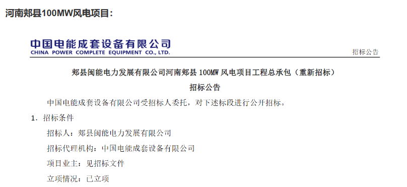 公告顯示,郟縣 100MW風(fēng)電項目位于河南省平頂山市郟縣,規(guī)劃裝機容量為 100MW,擬安裝20臺5.0MW風(fēng)電機組,新建 220kV 升壓站一座,并配置41.4MW/82.56MWh磷酸鐵鋰電池儲能。