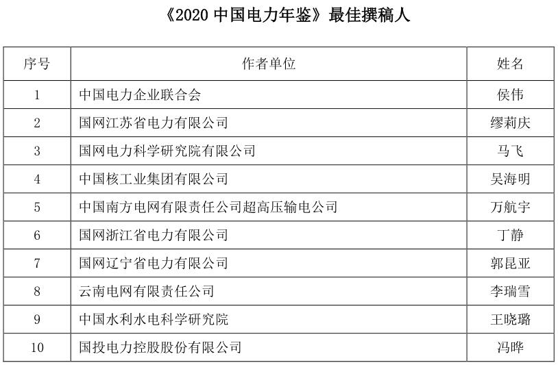 為促進(jìn)《年鑒》編撰質(zhì)量的進(jìn)一步提升,表彰在年鑒編撰工作中表現(xiàn)突出的先進(jìn)個人,根據(jù)《<中國電力年鑒>優(yōu)秀撰稿人評獎辦法(試行)》,經(jīng)年鑒編輯部初評、評選委員會審核,評選出《2020中國電力年鑒》最佳撰稿人和優(yōu)秀撰稿人,現(xiàn)將名單予以公示。