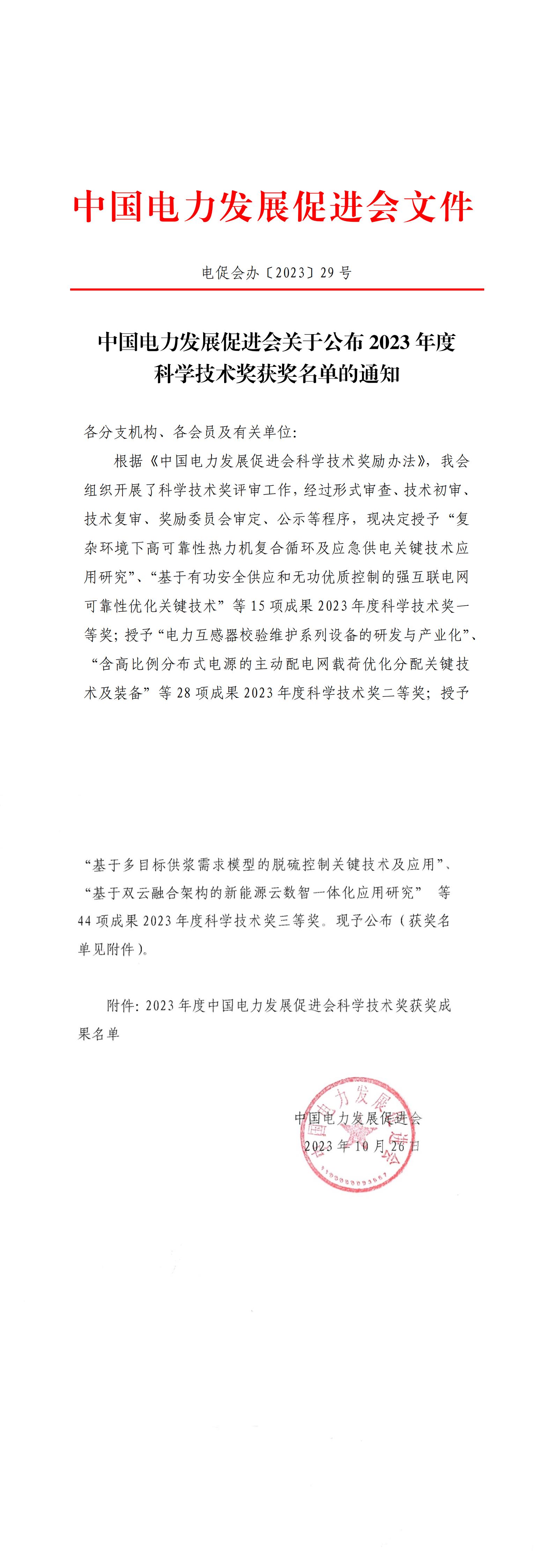 中國電力發(fā)展促進會關于公布2023年度科學技術獎獲獎名單的通知