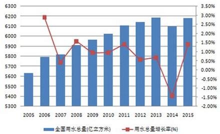 過去10年間,隨著人口增長,城市建設(shè)以及經(jīng)濟增長,全國用水總量總體呈現(xiàn)持續(xù)增長態(tài)勢,在2015年達(dá)到6180億立方米。(其中,由于首次進(jìn)行最嚴(yán)格水資源管理制度考核、以及農(nóng)業(yè)水價綜合改革和工業(yè)用水差別水價政策的推進(jìn),2014年的農(nóng)業(yè)和工業(yè)用水量分別出現(xiàn)下降,全國用水總量同時環(huán)比下降1.4%。)05至15年的用水總量年均復(fù)合增長率約為0.93%,據(jù)此計算到2030年全國用水總量將達(dá)到7100億立方米。這一預(yù)測與《全國水資源綜合規(guī)劃》劃定的2030年用水上限不超過7000億立方米基本一致。因此,在可預(yù)見的未來,用水量仍將繼續(xù)增長。