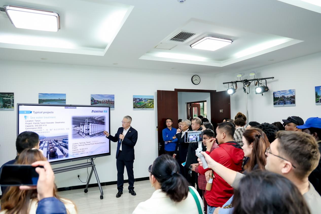 在近距離感受中信的水處理科技魅力后,在座談交流環(huán)節(jié),外媒對推動全球環(huán)境治理的“中信方案”與“中信技術”興趣濃厚,圍繞如何平衡生態(tài)保護與經濟發(fā)展、如何通過科技創(chuàng)新呵護綠色地球等話題,與中信環(huán)境展開熱烈而深入的交流。外媒團記者將目光聚焦于中信環(huán)境的核心業(yè)務優(yōu)勢、美能膜技術亮點、海外市場布局、項目建設計劃等內容,踴躍提問、積極發(fā)言。“中國茶與美能水給我們留下深刻印象,在水處理方面美能有何獨特技術優(yōu)勢?”“中信環(huán)境的生態(tài)技術和業(yè)務非常棒,未來是否有在中亞地區(qū)進一步開拓市場的計劃?”“作為一家國際環(huán)保企業(yè),中信環(huán)境在不同地區(qū)有何不同市場策略?”“中信環(huán)境如何保證海外項目的可持續(xù)發(fā)展?”……熱盼合作的情緒在交流中不斷升溫,為座談會營造了更加積極和富有建設性的氛圍。