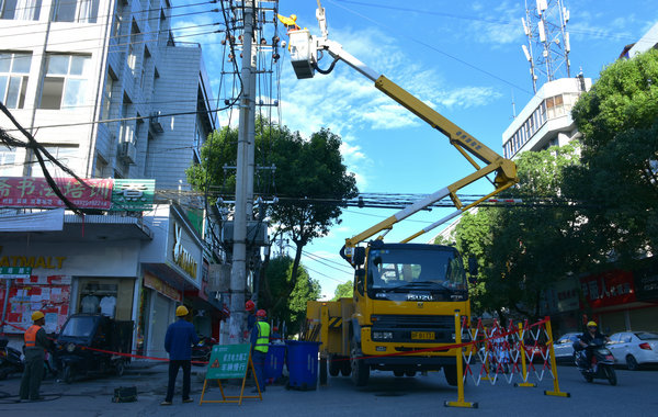 當(dāng)日早上5時(shí)30分,在施工現(xiàn)場(chǎng)圍好護(hù)欄、掛好提示路牌、進(jìn)行技術(shù)交底后,帶電作業(yè)班成員李強(qiáng)、闕華斌穿上厚重的絕緣服、戴上絕緣手套,熟練地爬上絕緣車(chē)斗內(nèi),車(chē)臂緩緩上升,進(jìn)入作業(yè)區(qū)域?qū)?dǎo)線(xiàn)進(jìn)行絕緣遮蔽,各項(xiàng)工作密切配合有序進(jìn)行,作業(yè)人員的汗水順著臉頰往下流,經(jīng)過(guò)近2個(gè)多小時(shí)的共同奮戰(zhàn),作業(yè)任務(wù)順利完成。當(dāng)作業(yè)人員回到地面,絕緣服內(nèi)的衣物已經(jīng)完全濕透,來(lái)不及脫下厚重的絕緣服,拿起一瓶礦泉水“咕咚咕咚”一飲而盡。