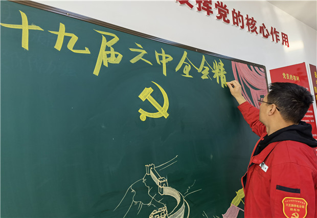 “線下”單位的青年黨員書寫黑板報,為了讓單位全體職工更全面、更及時地了解會議精神,黨員將十九屆六中全會的會議重點內(nèi)容經(jīng)過精心設(shè)計、編排,搬到了單位的黑板上。正在黨員活動室閱讀黑板報的積極分子說:“這個板報對全會的內(nèi)容歸納清晰、通俗易懂,這樣的學(xué)習(xí)形式讓我好像一下回歸學(xué)生時代,很受大家的歡迎。”除此之外,六五四供電公司黨支部還組織黨員結(jié)合工作崗位深入交流研討、撰寫心得體會,在學(xué)習(xí)中談?wù)J識體會、話發(fā)展變化,深化思想啟迪、促進共同提高。