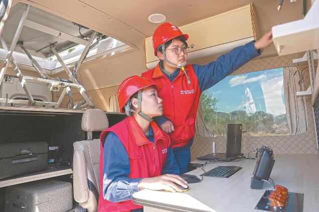 無(wú)人機(jī)智能巡檢黨員突擊隊(duì)隊(duì)員在無(wú)人機(jī)巡檢“航母”作業(yè)車內(nèi)查看山區(qū)輸配電線路情況