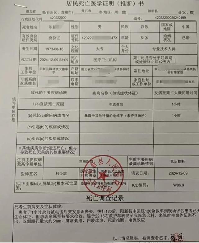 陳勇的中學同事們把他背到救護車能到達的地方,醫(yī)生說已經(jīng)沒有搶救的必要了。在家屬堅持下,他被送到醫(yī)院,經(jīng)過搶救后還是被宣布身亡。死亡推斷書顯示,直接死亡原因為“電流效應(yīng)”。