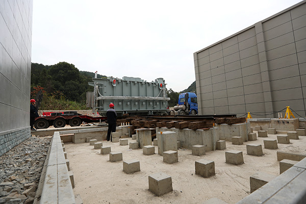 為保證變壓器順利運輸、安全就位。國網(wǎng)寧海縣供電公司前期做了大量的準備工作,與主變廠家、運輸公司、設計、施工單位人員多次溝通協(xié)調,帶領專業(yè)技術人員多次深入現(xiàn)場踏勘進站便道地形、路況,組織研討運輸和安裝方案,并對主變安裝施工人員進行了全面的安全、技術交底,對施工流程、人員分工、施工關鍵點控制等進行具體安排。由于本次主變來自山東魯能泰山電力設備有限公司,距離浙江寧海長達1015公里,承載著七十二噸的龐然大物,全程運輸六十五個小時,在克服沿線空障多、橋梁多、路況復雜等困難下,終于抵達了目的地。