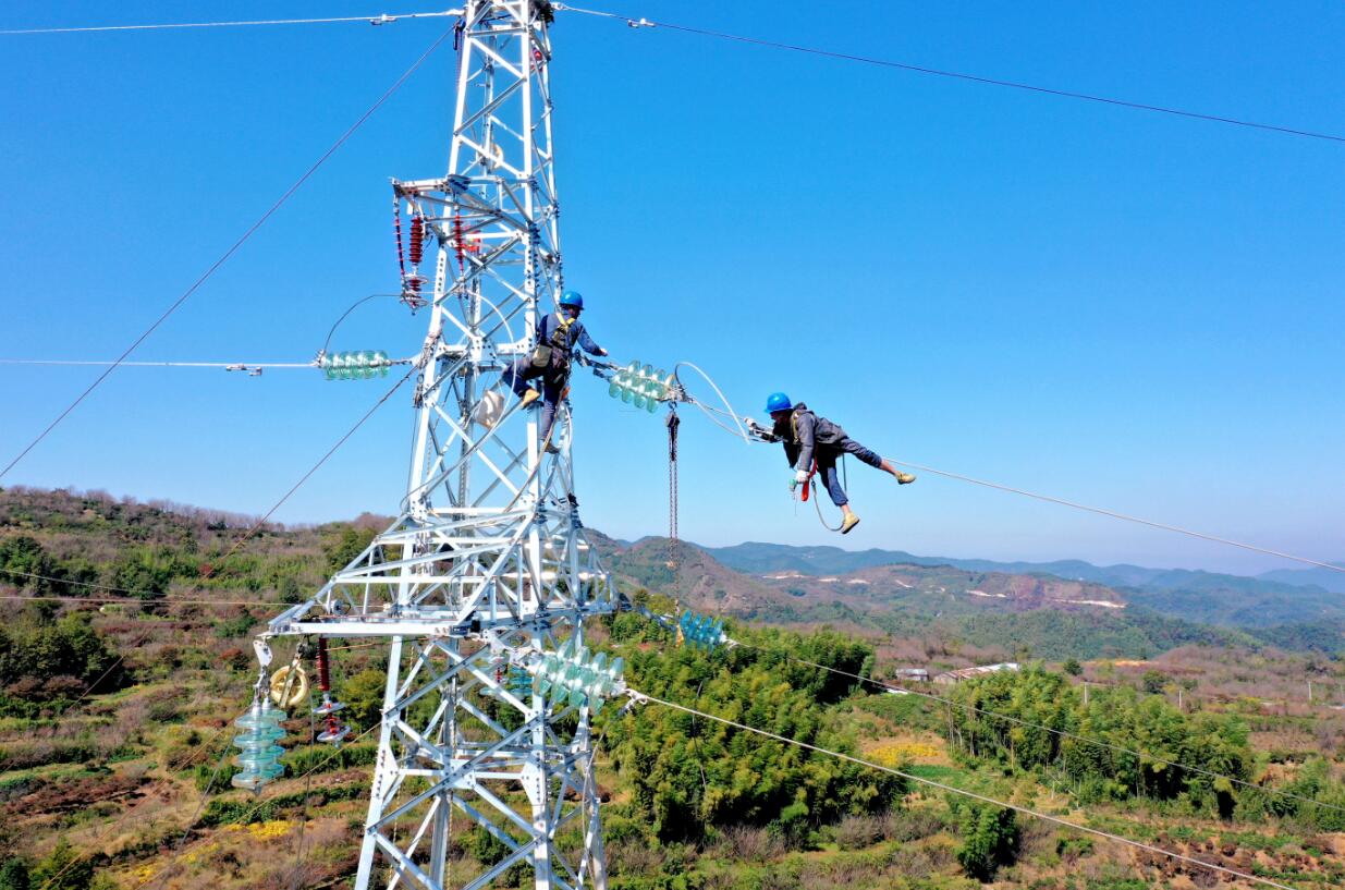10月21日,在余姚市大嵐鎮(zhèn)上馬崗村,群山環(huán)繞中,一座銀白色的鐵塔拔地而起,2名供電員工正在桿塔上安裝瓷瓶、牽引導(dǎo)線,這是35千伏鹿袁嵐38G6線大修改造現(xiàn)場。
