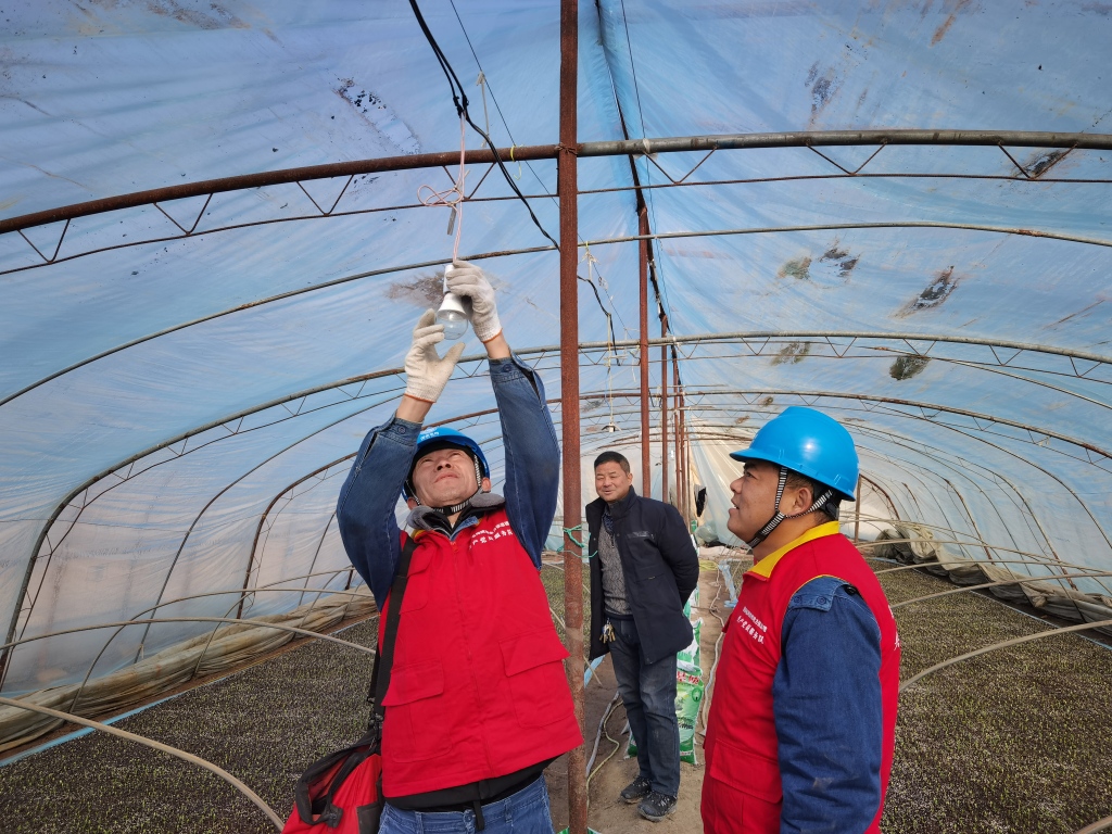 國家電網(wǎng)陜西電力張思德(頻陽之光)黨員服務(wù)隊在念田村甜瓜大棚更換補光燈。