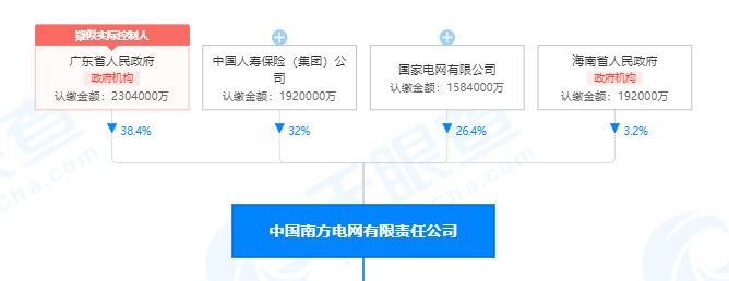 根據(jù)公開資料查詢,本次調(diào)整前中國(guó)南方電網(wǎng)總注冊(cè)資本為600億元。共有4家股東,股本比例是:廣東省人民政府出資230.4億,占比38.4%,為第一大股東,中國(guó)人壽保險(xiǎn)(集團(tuán))公司出資192億,占比32%,排名第二,國(guó)家電網(wǎng)有限公司出資158.4億,占比26.4%,排名第三,海南省人民政府認(rèn)繳19.2億,占比3.2%,排名最末。