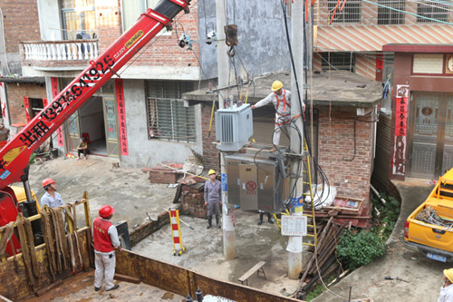 圖為8月18日下午雷雨停后,在寧遠(yuǎn)縣天堂鎮(zhèn)天堂社區(qū)曾家洞位置的10KM桐前線寄干支線故障搶修現(xiàn)場,電力黨員先鋒突擊隊員在更換被雷擊壞的變電器等設(shè)備。