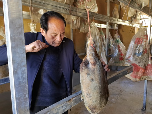 腌制火腿是黎馬村村民傳承已久的儲肉技藝,加上當?shù)鬲毺氐臍夂颦h(huán)境,黎馬火腿形美色艷香糯的獨特品質(zhì)一直在當?shù)匦∮忻麣?。但單家單戶腌制火腿不光?guī)模小,質(zhì)量也參差不齊。黎馬火腿雖然作為當?shù)氐奶厣r(nóng)產(chǎn)品,但一直未能創(chuàng)造出良好的經(jīng)濟價值。如何挖掘黎馬村火腿特色,將鄉(xiāng)村特色轉(zhuǎn)化為鄉(xiāng)村經(jīng)濟是李華所在的工作隊長期思考的問題。