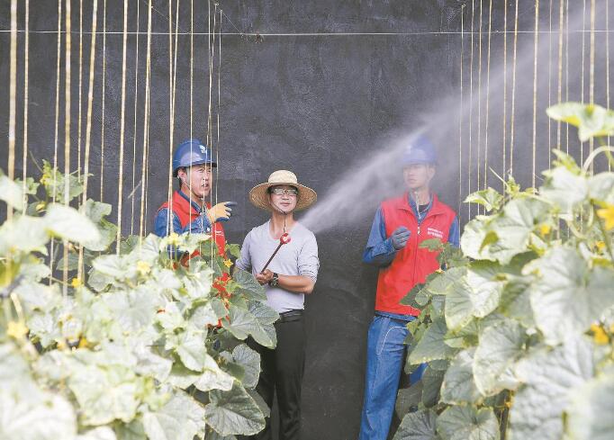 供電員工在昊苑村果蔬大棚內(nèi)了解黃瓜種植戶用電需求。攝影:袁宏彥