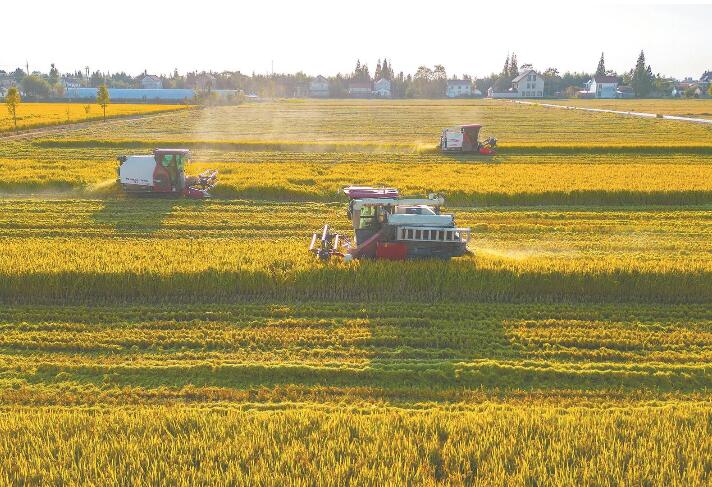10月30日,在江蘇省海安市開發(fā)區(qū)品建村的洋蠻河高標準農(nóng)田示范區(qū),南通季和智慧農(nóng)業(yè)有限公司的1800多畝水稻收割工作有序進行。俯瞰大地,金黃的稻田綿延成片,多臺收割機穿梭其中。