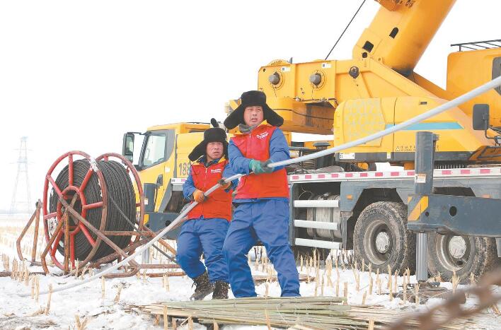 黨員突擊隊(duì)隊(duì)員在白城華能大安風(fēng)電220千伏新能源送出工程現(xiàn)場(chǎng)開展導(dǎo)線展放作業(yè)。尹航 攝