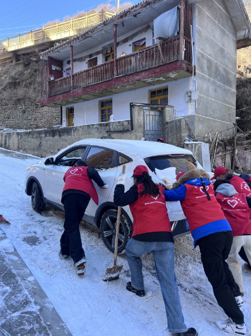 當(dāng)天早上,在德吉巷路,10余名身穿紅馬甲的“羊角花”志愿者分工協(xié)作、互相配合,有的負(fù)責(zé)鏟除厚重的積雪,有的專注清掃路面,確保不留死角。遇到結(jié)冰的地方,志愿者們更是齊心協(xié)力,用鐵鍬一點(diǎn)點(diǎn)破冰,再將碎冰和積雪清理干凈。在除雪過(guò)程中,一輛汽車爬坡行駛受路面冰雪影響,車輪不斷打滑,無(wú)法前進(jìn)。附近的志愿者們見(jiàn)狀,立刻放下手中工具,迅速趕來(lái)幫忙。他們分成兩組,一組在車后用力推動(dòng),一組在車前指揮方向,齊聲喊著口號(hào),齊心協(xié)力助力車主解決困難。經(jīng)過(guò)近兩小時(shí)的共同努力下,道路及兩旁的人行道清理出安全路線,方便群眾出行。