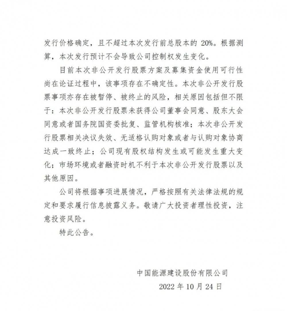 10月23日,中國能建公告稱,為助力公司“30·60”戰(zhàn)略目標落地,構(gòu)筑新能源、新基建、新產(chǎn)業(yè)“三新”發(fā)展平臺,公司正在籌劃非公開發(fā)行A股股票事項,擬將募集資金用于以新能源為主的新型綜合能源項目,包括光伏、風電、氫能、儲能等新能源一體化、專業(yè)化項目,新能源工程施工項目、新能源重大裝備采購,以及生態(tài)環(huán)境治理、新型基礎(chǔ)設(shè)施等項目。據(jù)悉,本次募集資金總額在人民幣150億元以內(nèi)。本次非公開發(fā)行股票方案最終以經(jīng)公司董事會、股東大會批準及國務(wù)院國資委批復、本公司證券上市地的證券監(jiān)管機構(gòu)核準的方案為準。