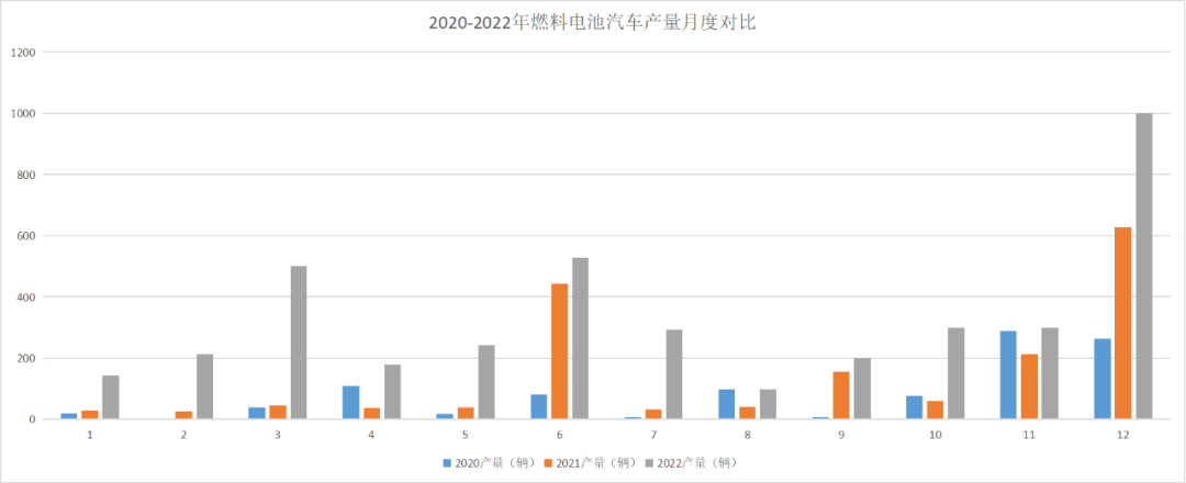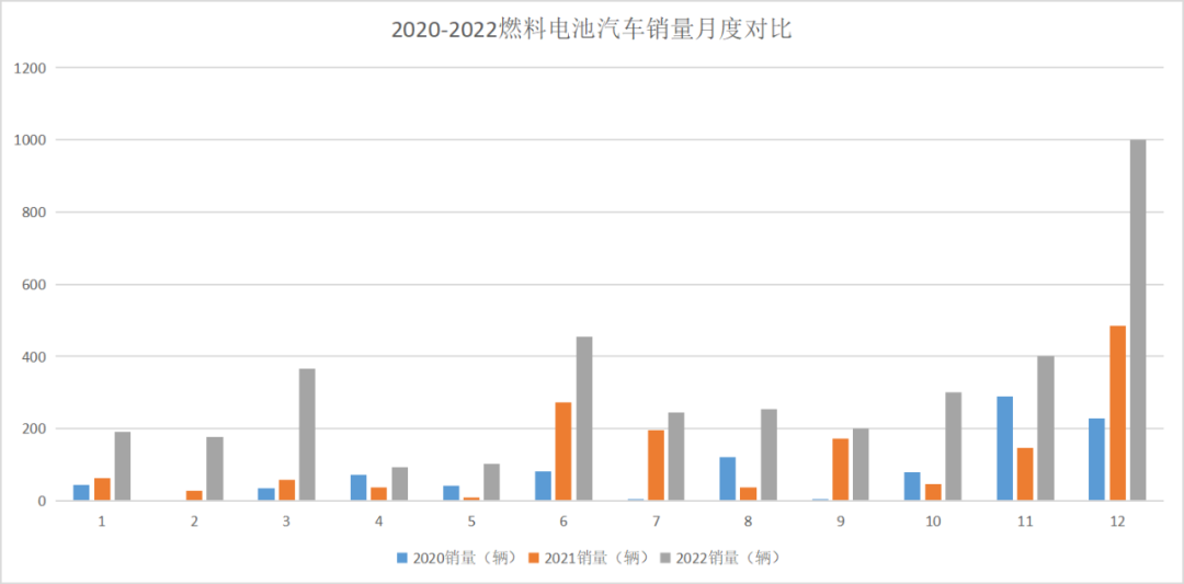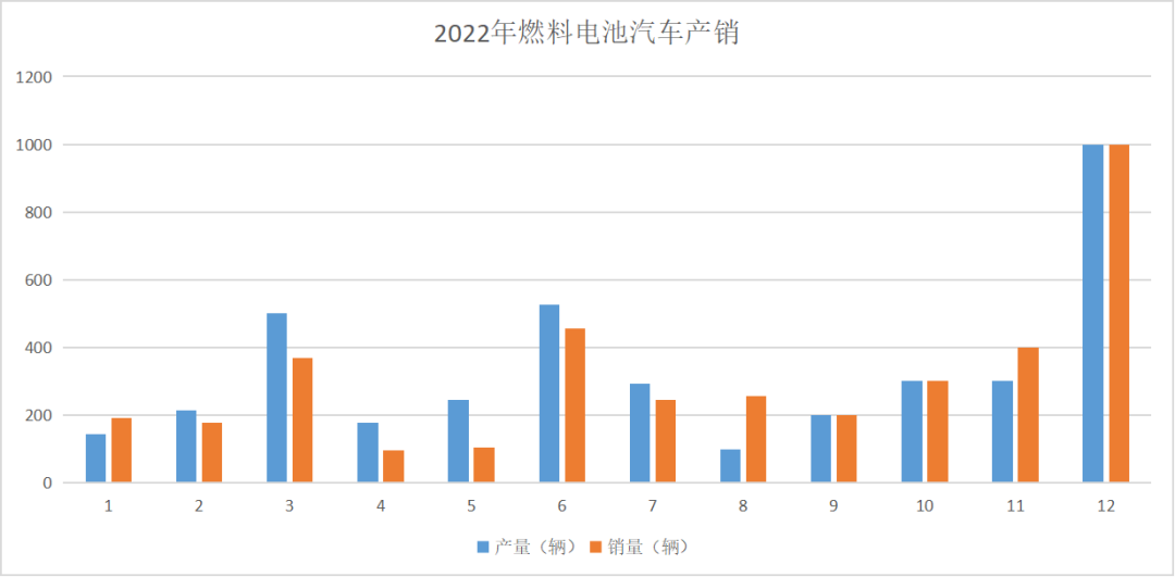 2022年全年,燃料電池汽車產(chǎn)銷分別完成0.4萬(wàn)輛和0.3萬(wàn)輛,同比增長(zhǎng)105.4%和112.8%。其中,12月份完成產(chǎn)銷數(shù)量最多,均完成0.1萬(wàn)輛;其次是3月份及6月份,3月,燃料電池汽車產(chǎn)銷分別完成500輛和367輛,同比增長(zhǎng)10.1倍和5.2倍;6月,燃料電池汽車產(chǎn)銷分別完成527輛和455輛,同比增長(zhǎng)18.7%和67.3%。