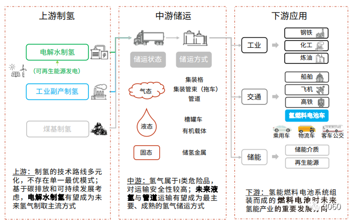 氫能產(chǎn)業(yè)鏈主要由上游制氫—中游儲運(yùn)—下游應(yīng)用組成。