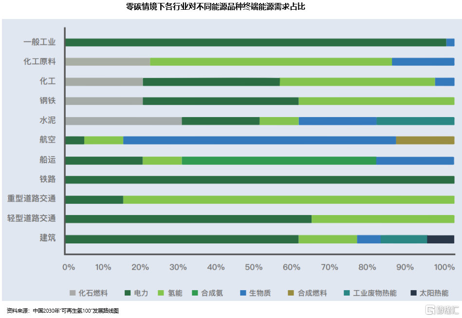 我們可以參考中國(guó)氫能聯(lián)盟研究院的數(shù)據(jù)。上圖是在零碳狀態(tài)下,各個(gè)行業(yè)終極的能源來(lái)源。在化工原料、化工、鋼鐵、重型交通運(yùn)輸?shù)刃袠I(yè),氫能都是絕對(duì)的第一主力。即使在那些電力絕對(duì)主導(dǎo)的行業(yè),氫能可能也是其電力的重要來(lái)源。