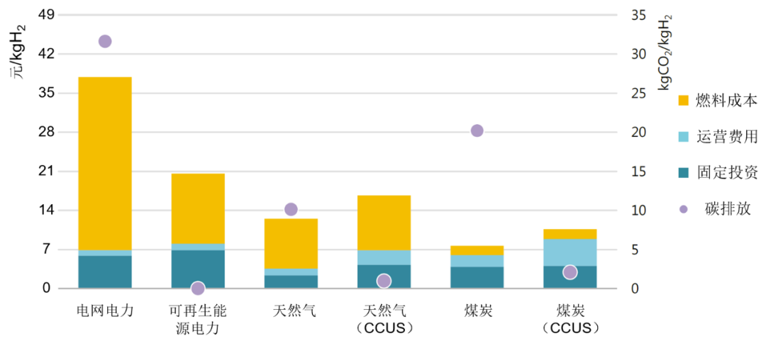 圖2 氫氣生產(chǎn)成本及碳排放情況對比