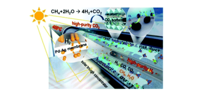 中國科學(xué)院工程熱物理研究所首次實現(xiàn)了400°C溫和條件下“凈零排放”的天然氣制氫原理突破。通過有序分離氫氣和二氧化碳產(chǎn)物,天然氣制氫反應(yīng)溫度由傳統(tǒng)的800-1000°C降至400°C以下,實現(xiàn)了99%以上甲烷直接轉(zhuǎn)化為高純氫與高純二氧化碳,并實現(xiàn)了基于化石能源的制氫與脫碳的完全協(xié)同。制氫與脫碳能耗下降幅度達(dá)20-40%。基于此,該工作結(jié)合商業(yè)化中溫槽式聚光技術(shù),實現(xiàn)了太陽能驅(qū)動的天然氣制氫與脫碳,進(jìn)一步減少化石能源制氫的碳足跡,展示了化石能源與可再生能源互補實現(xiàn)可持續(xù)氫能利用的可行性。反應(yīng)溫度的降低使工業(yè)余熱與氫能的結(jié)合成為可能。迄今為止,研究人員已完成了超過6000次的穩(wěn)定循環(huán)實驗,驗證了該方法的可靠性,并初步展示了技術(shù)轉(zhuǎn)化應(yīng)用的廣闊前景。