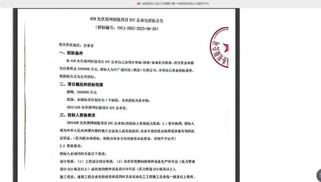 通報(bào)還稱,6月12日,該公司在區(qū)市場監(jiān)管局注冊全資子公司中廣通科技(酒泉)有限公司。6月13日,中廣通科技(酒泉)有限公司工作人員嚴(yán)微明向項(xiàng)目聯(lián)系人、區(qū)工信局副局長馬斌提交公司營業(yè)執(zhí)照復(fù)印件、《“離網(wǎng)制氫”項(xiàng)目投資合作協(xié)議》兩份資料,由馬斌代其在甘肅省政務(wù)網(wǎng)在線審批監(jiān)管平臺提交了項(xiàng)目備案申請,區(qū)發(fā)改局政務(wù)大廳首席代表李倩在向分管領(lǐng)導(dǎo)王泉德匯報(bào),并向酒泉新能源綜合利用產(chǎn)業(yè)園管理辦公室副主任閆斌征求意見后,為該公司辦理了項(xiàng)目備案。6月21日,中廣通科技(酒泉)有限公司在未進(jìn)行項(xiàng)目可行性研究,未辦理項(xiàng)目規(guī)劃、土地、環(huán)評等前期手續(xù),也未與相關(guān)部門溝通的情況下,在“中國招投標(biāo)公共服務(wù)平臺”發(fā)布了《4GW光伏離網(wǎng)制氫項(xiàng)目EPC總承包招標(biāo)公告》。