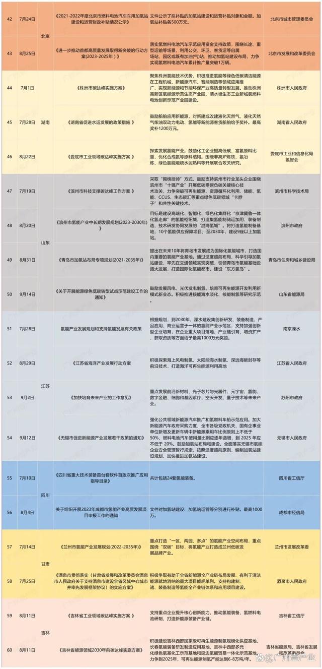 9月17日,浙江省嵊州市人民政府發(fā)布了《關(guān)于加快推進(jìn)新能源裝備產(chǎn)業(yè)高質(zhì)量發(fā)展的實(shí)施意見(jiàn)(征求意見(jiàn)稿)》。其中提到,積極布局發(fā)展氫能產(chǎn)業(yè)。布局發(fā)展氫能“制儲(chǔ)輸用”、氫燃料電池系統(tǒng)等氫能產(chǎn)業(yè)鏈。9月14日,山東省能源局發(fā)布了《關(guān)于開(kāi)展能源綠色低碳轉(zhuǎn)型試點(diǎn)示范建設(shè)工作的通知》。文件中涉及到氫能的內(nèi)容有:鼓勵(lì)發(fā)展風(fēng)電、光伏發(fā)電制氫,培育可再生能源開(kāi)發(fā)利用新模式新業(yè)態(tài);積極推進(jìn)核能海水淡化、核能制氫等研究示范等。9月13日,佛山市人民政府印發(fā)了《佛山市碳達(dá)峰實(shí)施方案》的通知。方案中提到,重點(diǎn)發(fā)展氫能產(chǎn)業(yè)。牽頭推進(jìn)廣東燃料電池汽車(chē)示范應(yīng)用城市群建設(shè),強(qiáng)化城市群內(nèi)各市資源共享、優(yōu)勢(shì)互補(bǔ)。加強(qiáng)氫能基礎(chǔ)設(shè)施建設(shè)。推動(dòng)氫能示范應(yīng)用擴(kuò)面,促進(jìn)氫能產(chǎn)業(yè)要素集聚,培育引進(jìn)優(yōu)勢(shì)骨干企業(yè),實(shí)現(xiàn)氫能產(chǎn)業(yè)強(qiáng)鏈補(bǔ)鏈,打造大灣區(qū)氫能產(chǎn)業(yè)高地。持續(xù)推動(dòng)南海區(qū)“仙湖氫谷”、一汽解放南方新能源汽車(chē)基地等園區(qū)載體建設(shè)。到2025年,培育氫能及燃料電池企業(yè)超過(guò)170家,到2030年,培育氫能及燃料電池企業(yè)超過(guò)200家。......據(jù)廣州壹產(chǎn)業(yè)不完全統(tǒng)計(jì),截至9月25日,今年第三季度(7、8、9月),部委共發(fā)布15條與氫能相關(guān)的政策,地方則有23個(gè)省(市)發(fā)布了70條氫能政策,合計(jì)85條。