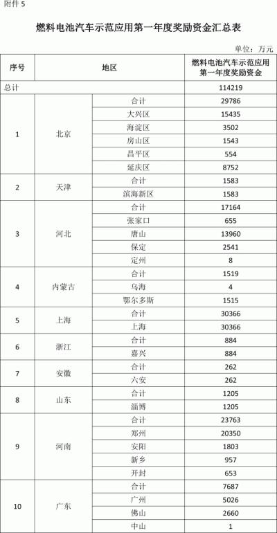 根據公示文件,第一年度共有10個省級行政區(qū)獲得燃料電池車示范應用獎勵資金,其中北京29786萬元、天津1583萬元、河北17164萬元、內蒙古1519萬元、上海30366萬元、浙江884萬元、安徽262萬元、山東1205萬元、河南23763萬元、廣東7687萬元,總計114219萬元。