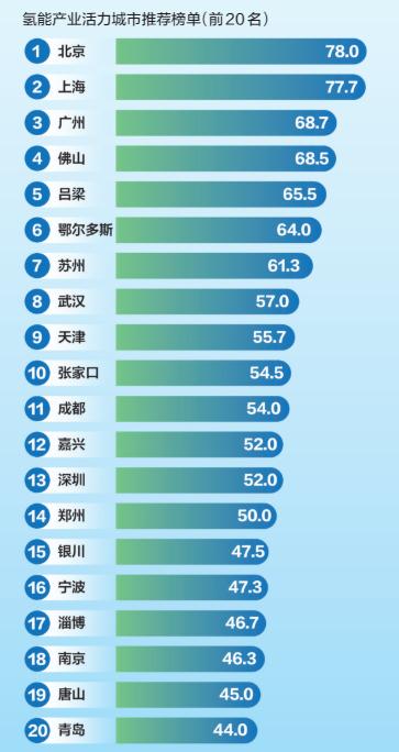 基于全國氫能產(chǎn)業(yè)發(fā)展的地區(qū)分布特點 ,新京報零碳研究院對主要城市的氫能資源稟賦 、政策環(huán)境 、產(chǎn)業(yè)規(guī)模 、項目投資 、基礎設施和企業(yè)數(shù)量等維度數(shù)據(jù)進行了量化和綜合評價 ,篩選出了全國20個氫能產(chǎn)業(yè)發(fā)展活力城市 。具體城市名單如下: