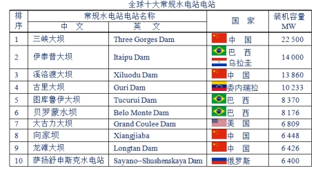 常規(guī)水電站是利用天然河流、湖泊等水能的發(fā)電站。目前世界上最大的水力發(fā)電站是在中國的三峽發(fā)電站(Three Gorges Dam),裝機(jī)容量達(dá)22500MW。