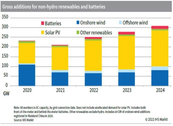 根據(jù)國際市場研究機構(gòu)IHS Markit的白皮書,全球每年可再生能源發(fā)電容量增量將從2020年的200吉瓦增加到2022年的約250吉瓦,然后到2024年增加到300吉瓦以上。