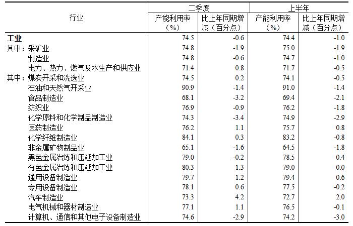 二季度,全國工業(yè)產(chǎn)能利用率為74.5%,比一季度上升0.2個百分點(diǎn)。