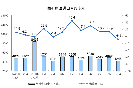 原油生產(chǎn)增速加快,進(jìn)口增速由增轉(zhuǎn)降。11月份,生產(chǎn)原油1720萬噸,同比增長2.6%,增速比10月份加快2.1個(gè)百分點(diǎn),日均產(chǎn)量57.3萬噸。進(jìn)口原油4245萬噸,同比下降9.2%,10月份為增長13.6%。