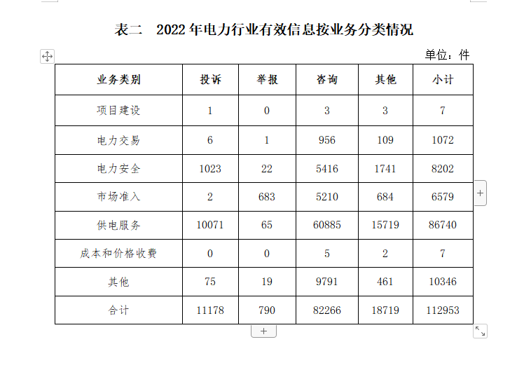 電力行業(yè)排在首位,有效信息數(shù)量為112953件,占全部有效信息的68.82%。群眾關(guān)注的內(nèi)容主要集中在供電服務(wù)、電力安全、市場準(zhǔn)入等方面。(2022年電力行業(yè)有效信息按業(yè)務(wù)分類情況見表二)