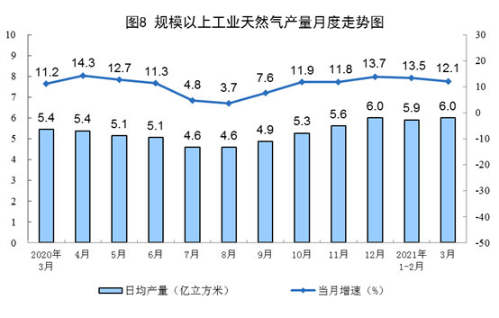 天然氣生產(chǎn)保持較快增長。3月份,生產(chǎn)天然氣185億立方米,同比增長12.1%,比2019年3月份增長24.7%,兩年平均增長11.7%,日均產(chǎn)量6.0億立方米。