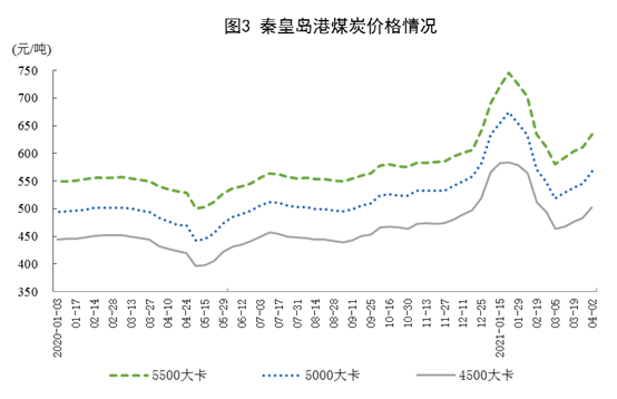 港口煤炭綜合交易價(jià)格有所上漲。4月2日,秦皇島港5500、5000和4500大卡煤炭價(jià)格分別為每噸634元、567元和502元,比3月5日分別上漲54元、49元和39元。