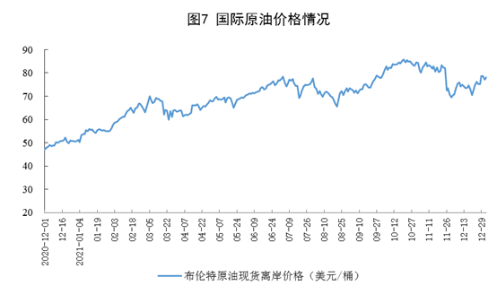 原油進(jìn)口由降轉(zhuǎn)增,國(guó)際原油價(jià)格上漲。12月份,進(jìn)口原油4614萬(wàn)噸,同比增長(zhǎng)19.9%,上月為下降8.0%;2021年,進(jìn)口原油51298萬(wàn)噸,比上年下降5.4%。12月31日,布倫特原油現(xiàn)貨離岸價(jià)格為77.24美元/桶,比11月30日的70.86美元/桶上漲9.0%。