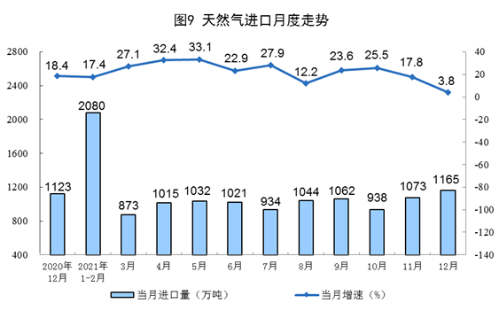 天然氣進(jìn)口增速回落。12月份,進(jìn)口天然氣1165萬(wàn)噸,同比增長(zhǎng)3.8%,增速比上月回落14.0個(gè)百分點(diǎn)。2021年,進(jìn)口天然氣12136萬(wàn)噸,比上年增長(zhǎng)19.9%。