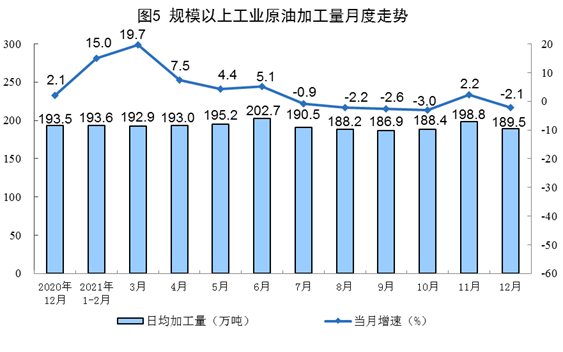 原油生產(chǎn)增速略有回落,加工量由增轉(zhuǎn)降。12月份,生產(chǎn)原油1647萬(wàn)噸,同比增長(zhǎng)1.7%,增速比上月放緩1.0個(gè)百分點(diǎn),比2019年同期增長(zhǎng)2.6%,兩年平均增長(zhǎng)1.3%,日均產(chǎn)量53.1萬(wàn)噸;加工原油5873萬(wàn)噸,同比下降2.1%,上月為增長(zhǎng)2.2%,比2019年同期下降0.1%,兩年平均下降0.1%,日均加工189.5萬(wàn)噸。